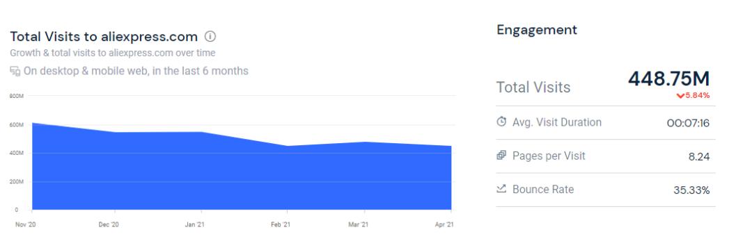 根据SimilarWeb的数据统计,最近6个月,速卖通(aliexpress.com)PC端和移动端合计总访问量约4.5亿,这个数字不到亚马逊的1/5,约为eBay的1/2。(注:此处所指访问量均不含APP访问量。)