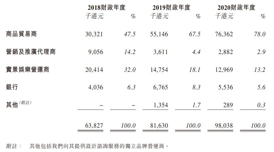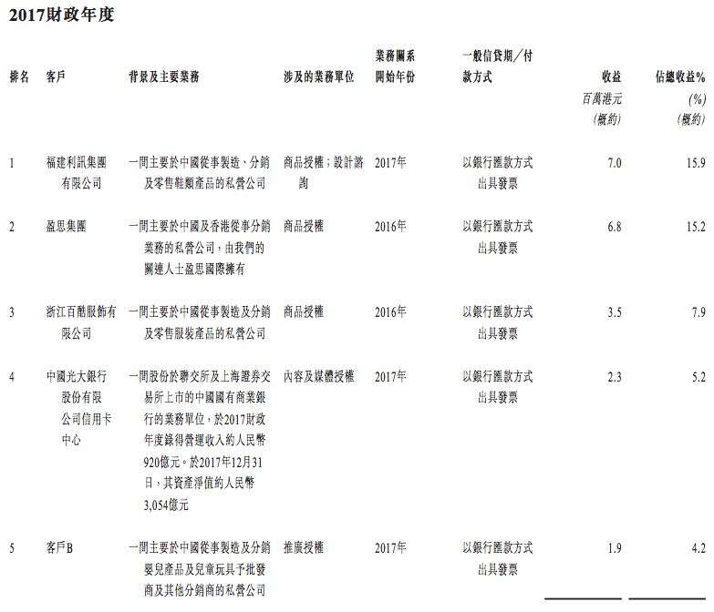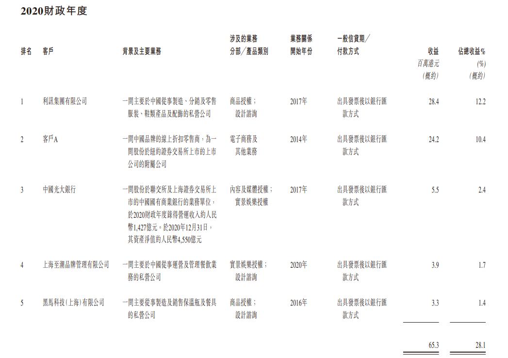 德盈国际的授权客户涵盖多个消费板块,2020年度前五大客户分别是生产鞋服的利讯集团、客户A(三文娱注:应为唯品会)、光大银行、运营小黄鸭奶茶的餐饮公司上海至潮品牌管理和生产销售餐具的黑马科技。2018-2019年的前五大客户中还有华侨城、香港某室内游乐园、深圳前海食为先食品有限公司等。