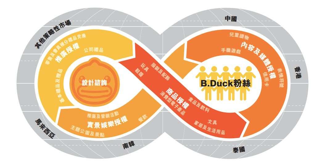 基于小黄鸭,德盈发展出五项业务:商品授权、实景娱乐授权、内容及媒体授权、推广授权以及设计咨询。