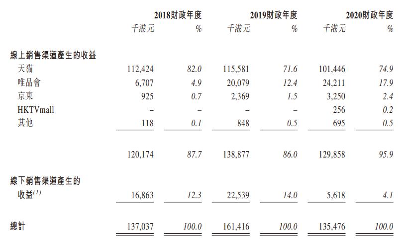 近两年,德盈的唯品会和京东渠道销售收入增长迅猛,不过相比于天猫体量尚小。2020年,德盈来自天猫渠道收益1.01亿港元,唯品会渠道2421.1万港元,京东渠道325万港元,线下渠道受疫情冲击下滑至561.8万港元。