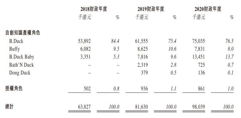 德盈的授权收入主要来自小黄鸭家族IP,截至2020年末,德盈创作和经营了多个角色,主要包括小黄鸭角色(B.Duck)、小黄鸭妹妹(Buffy)、小小黄鸭(B.Duck Baby)、为周冬雨创作的DongDuck,还有黑鸭子Bath’N Duck。