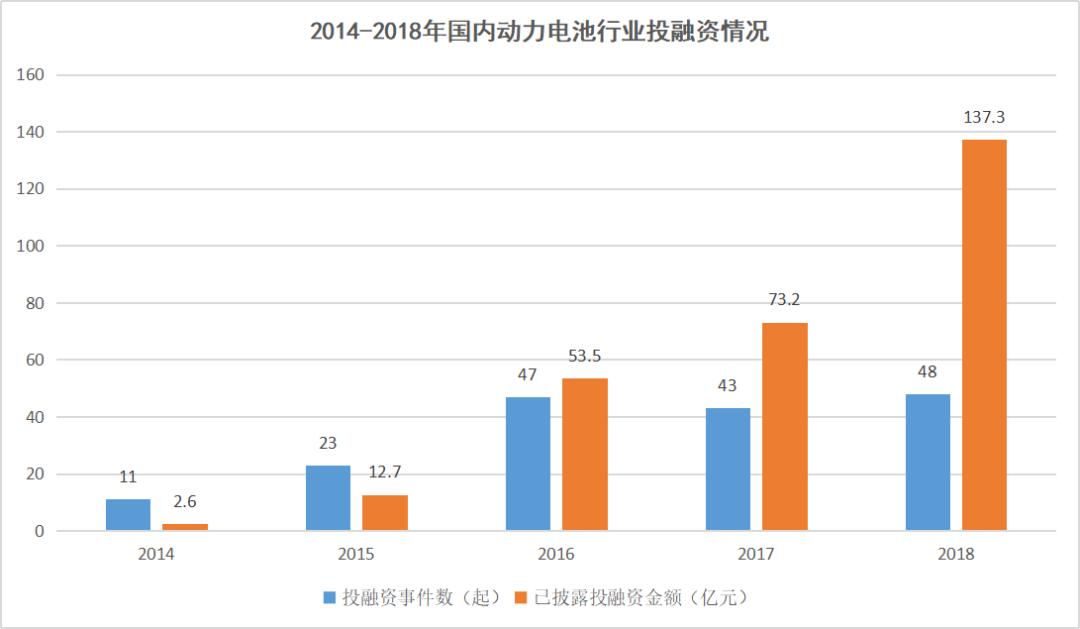 据企查查数据显示,自2014年开始国内动力电池行业的投融资数和投融资金额都呈现大幅增长趋势,数量从2014年的11起,增长至2018年的48起;投融资金额也从2014年的2.6亿元,增长至2018年的137.3亿元。