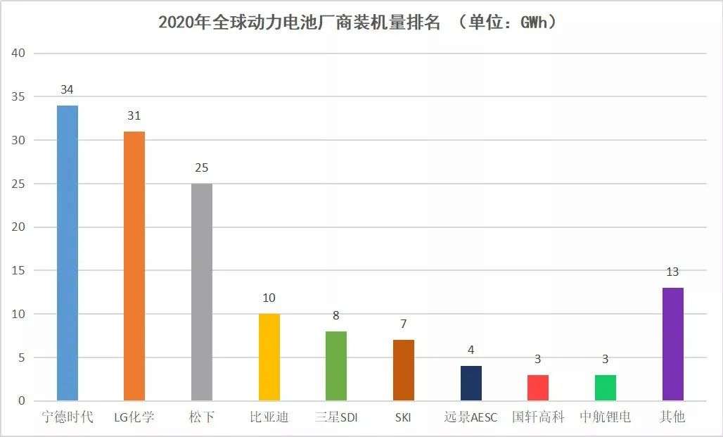 据SNE Research 发布的数据显示,在2020年全球动力电池厂商装机量排名中,宁德时代以34GWh排名第一,LG化学和松下分别以31GWh和25GWh分列二、三位,比亚迪和国轩高科为第四位和第八位。