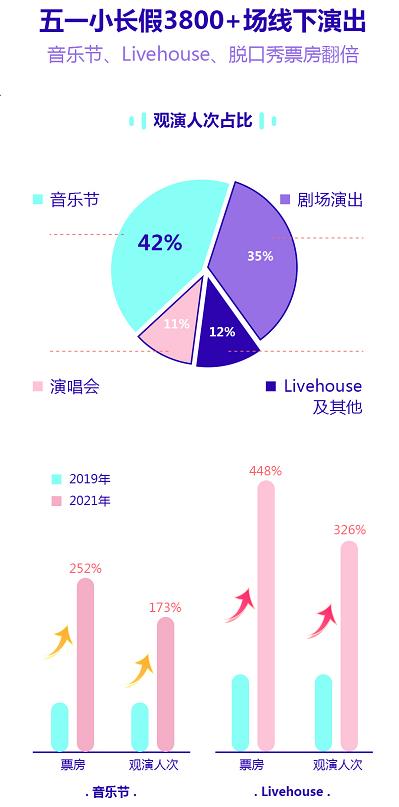 大麦数据显示,在livehouse方面,票房同比2019年增长448%,观演人次同比2019年增长326%;在剧场演出方面,今年“五一”脱口秀演出票房同比2019年增长312%。