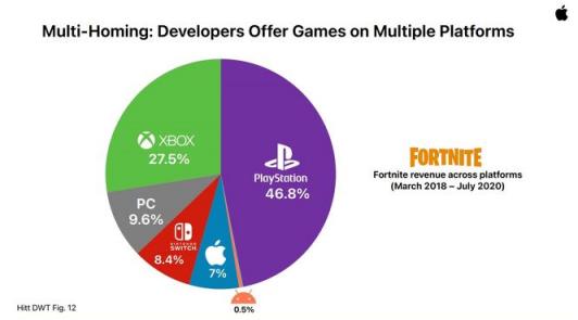 然而《堡垒之夜》被苹果下架之前,它在iOS端的收入仅为7亿美元,2018年3月至2020年7月,iOS方面仅占总收入的7%,安卓只有0.5%。Epic表示2020年iOS端的收入将会减少到5.8%。日活跃用户中苹果仅占10%。