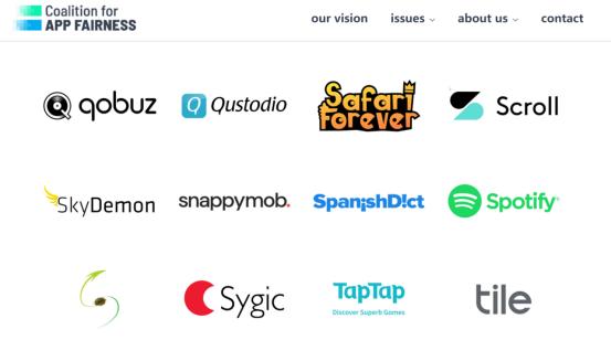 去年9月,Epic联合12家公司共同成立了“应用程序公平联盟”(Coalition for App Fairness,简称CAF),涉及范围扩散到了音乐、社交、购物、在线支付、健身等领域,目前官网公布成员接近50个,国内TapTap也在其中。