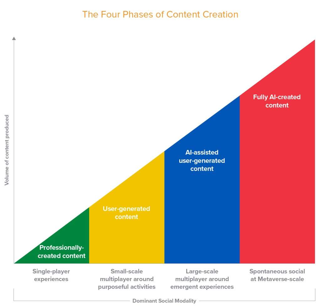 我们已经在类似《侠盗猎车手》(Grand Theft Auto)之类的开放世界沙盒视频游戏里面瞥见这种自发交互的微光,但是这些体验仍受到专业创作内容供应有限的限制。但是在两个关键趋势:UGC(用户生成内容)的激增与AI不断渗透到创作者工具等领域的推动下,对真实世界的意外发现进行建模的,完全涌现式的社交体验将成为规范。当我们采用新办法去创作内容时,我们还将解锁新型的社交体验。