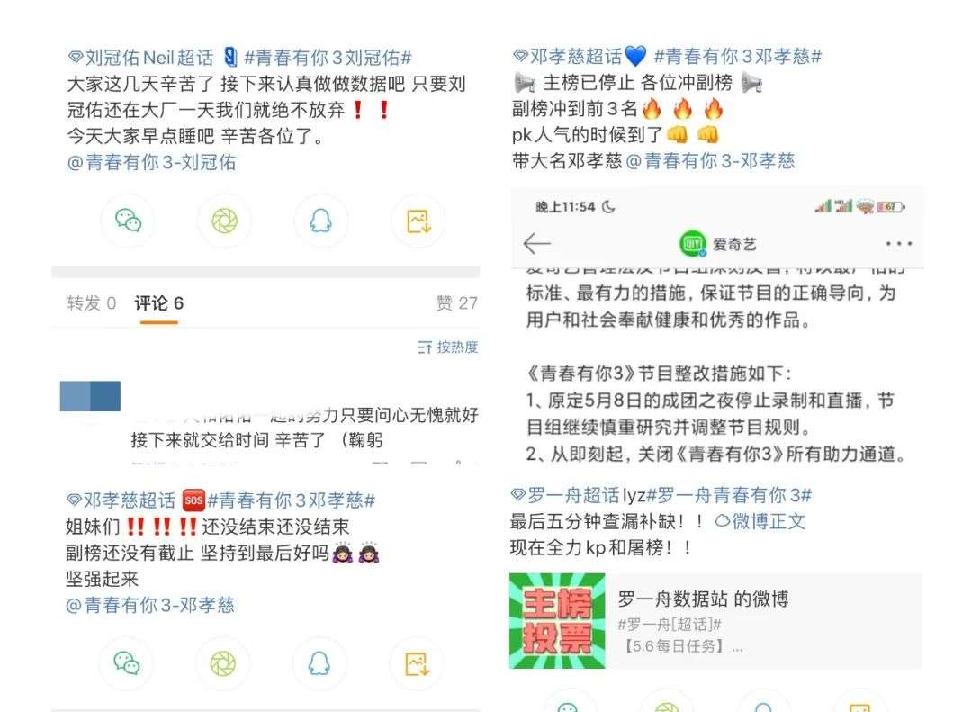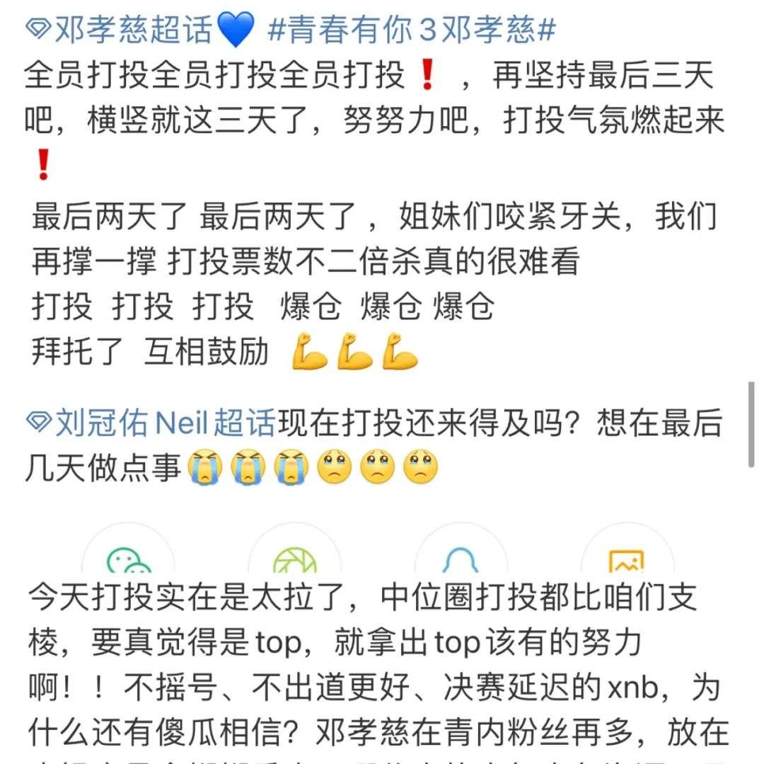 而另一边,两耳不闻窗外事的饭圈内部,依旧在没日没夜地为偶像打投。各个《青春有你3》参赛选手的超话里,打投依然是最重要的事,没有之一。即便主榜关闭了,更多的副榜也同样重要。