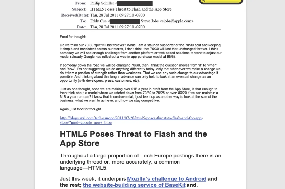 比如早在2011年的时候,苹果公司内部的高层就讨论过30%抽成合理性的问题,并且考虑过调整政策。负责App Store业务的Phil Schiller,曾在写给乔布斯和另一位高层的邮件里直白地写道“我们真的能指望三七这种分成模式永远持续下去吗?”。