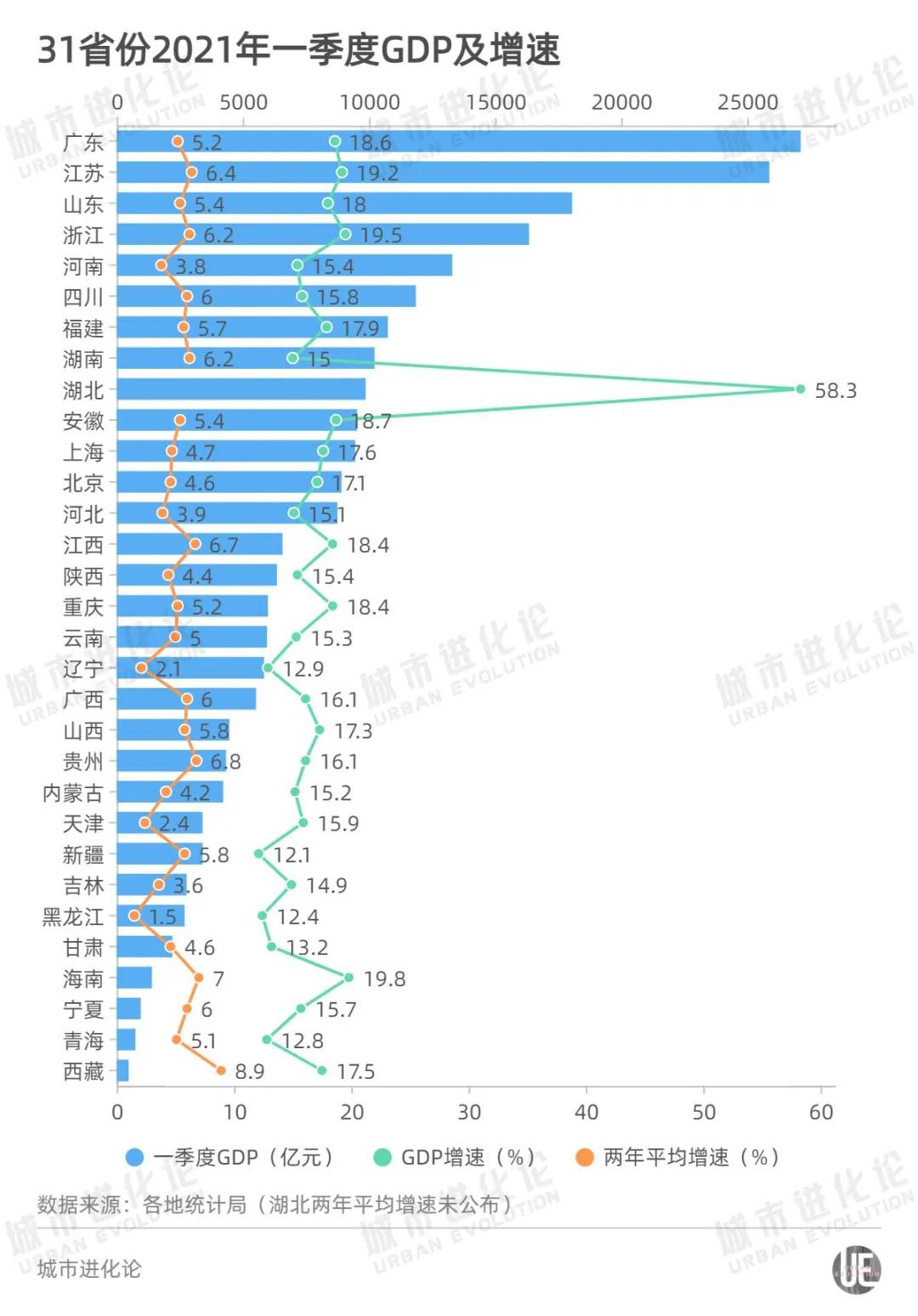 从全国来看,今年一季度,31省份均实现GDP两位数增长。湖北、海南、浙江、江苏、安徽、广东、江西和重庆8个省份跑赢全国18.3%的增速。