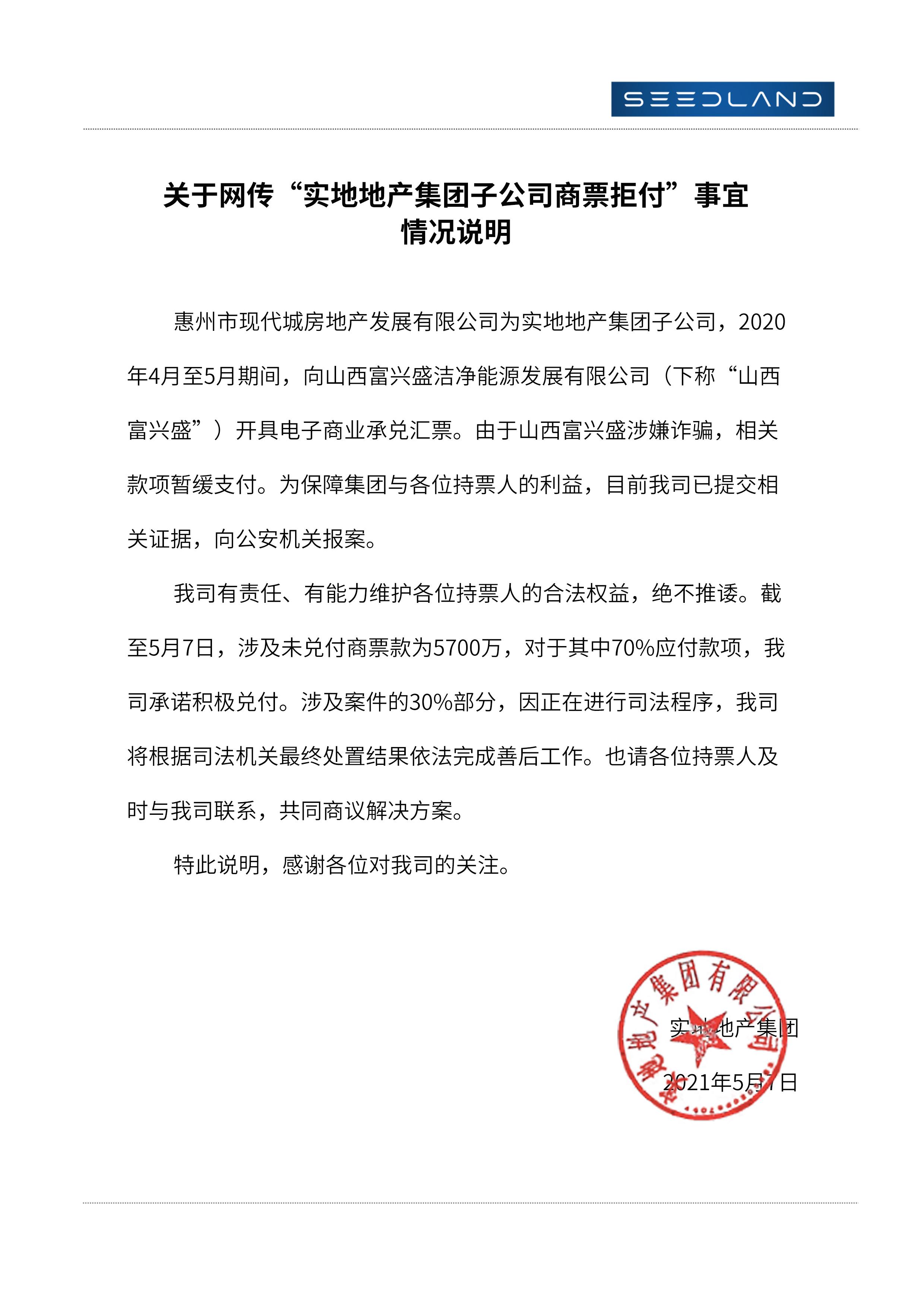 随后,实地地产在官网发布声明称,2020年4月~5月期间,子公司惠州市现代城房地产发展有限公司(下称惠州现代城)向山西富兴盛洁净能源发展有限公司(下称山西富兴盛)开具电子商业承兑汇票。由于山西富兴盛涉嫌诈骗,相关款项暂缓支付。为保障集团与各位持票人的利益,目前我司已提交相关证据,向公安机关报案。