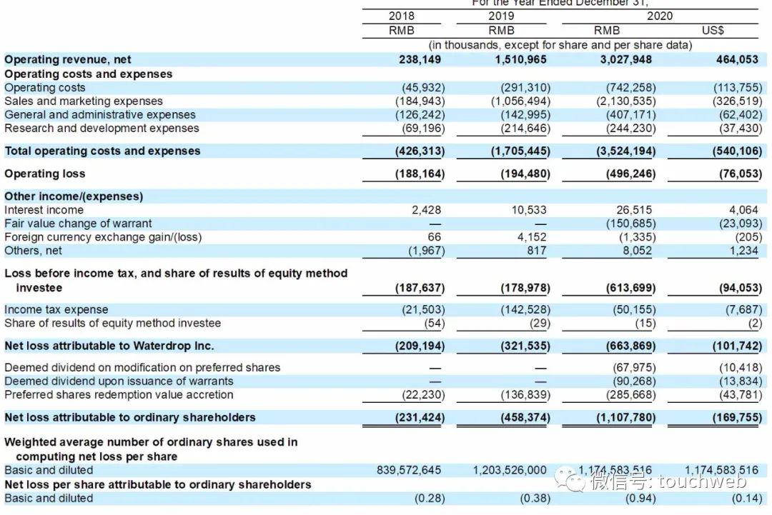 随着支出增加,水滴公司的亏损也呈加大趋势。2018年、2019年、2020年,其运营亏损分别为1.88亿元、1.95亿元、4.96亿元。