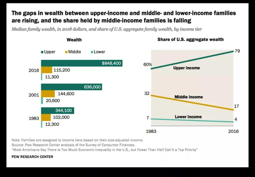 各收入阶层之间的差距越来越大,中等收入家庭占据的份额在下滑 | 图片来源: Pew Research Center