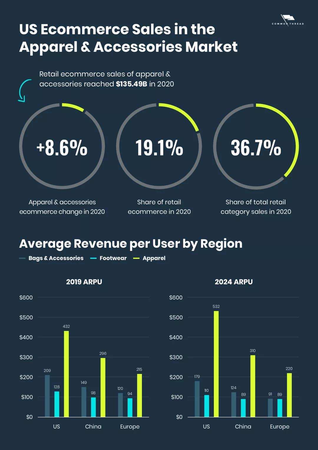 美国服装&配饰电商销售数据(上)和区域市场的 ARPU 水平 | 数据来源:Statista 和 eMarketer