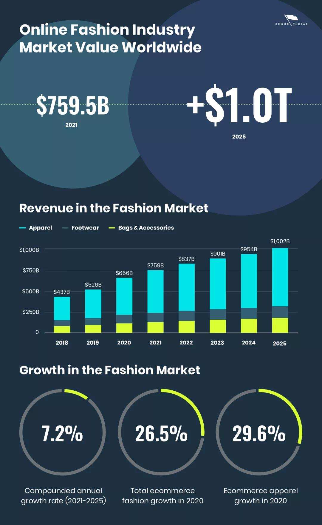 接下来的五年里,时尚产业的线上交易规模将保持 7.18% 的年复合增长率,这会推动这个行业的线上规模超过 1 万亿美元。