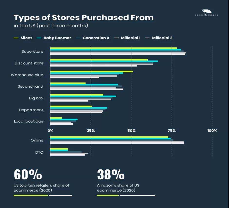 过去 3 个月美国各世代消费者所选择的各购物渠道 | 数据来源:Statista