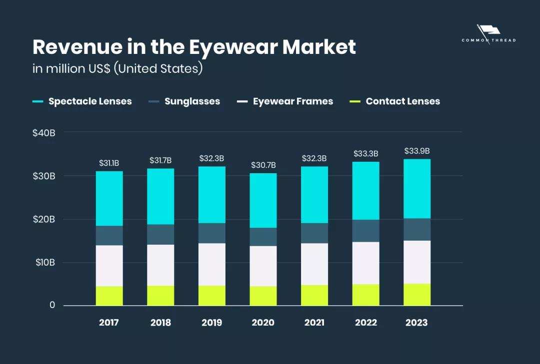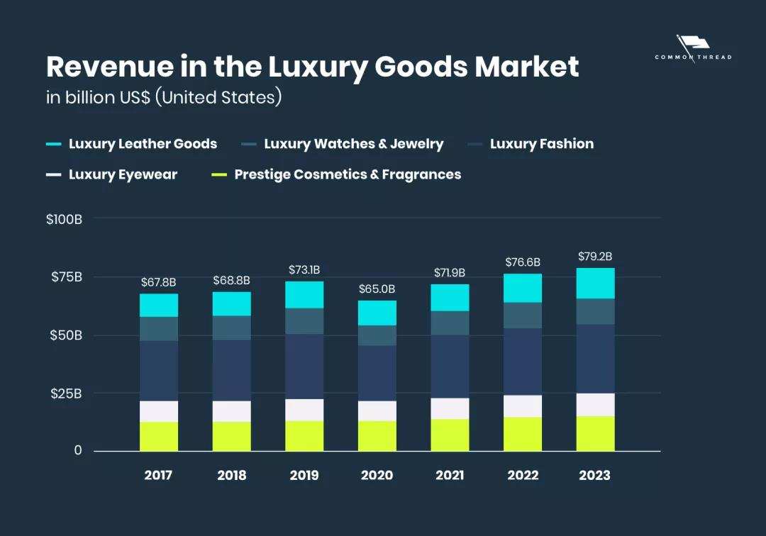 2017——2023年,服装、配饰、鞋子、奢侈品和眼镜的零售额(从上到下) | 数据来源:Statista