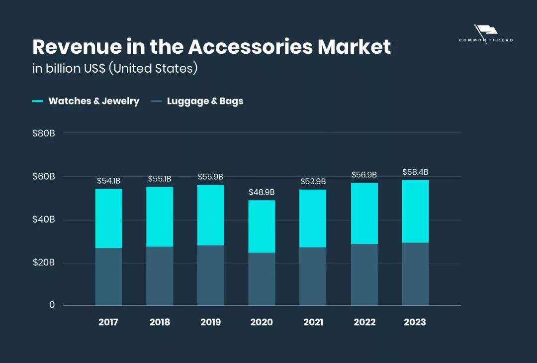 根据 Statista 的数据,总体上 2020 年时装产业收入与 2019 年相比略有下降。对美国市场的户数进行一部分分析可以看出明显的差异,奢侈品和配饰(如手表、珠宝、箱包)市场受到重创。