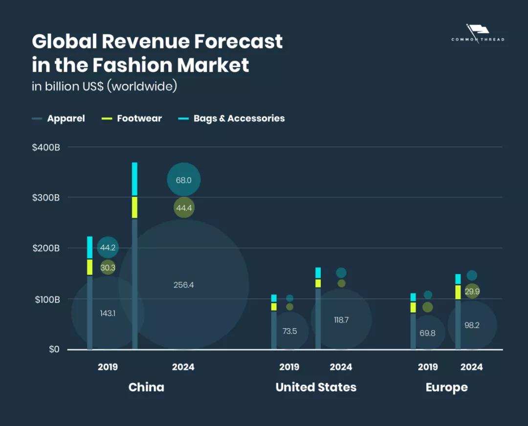 从地理位置上看,时尚产业的消费严重向中国市场倾斜。2020 年中国销售额为 2843 亿美元,超过第 2-5 名四个国家的总和: