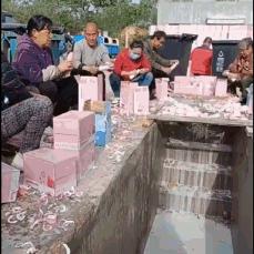 一群中年人谈笑风生,一手拿着工具,一手拿着瓶子拆瓶盖,然后把瓶盖留下,牛奶倒进沟里。