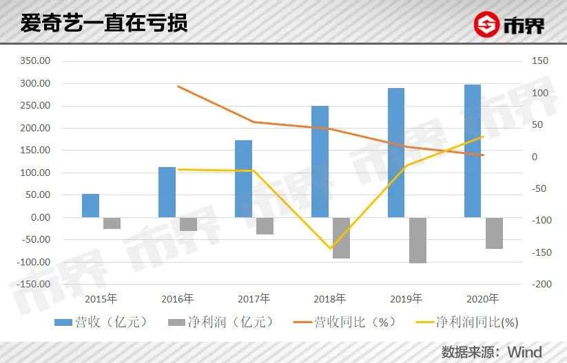 这是“爱优腾”厮杀了10多年,也没能交出的成绩单。根据爱奇艺历年财报,2015-2020年间,爱奇艺亏损金额分别为26亿元、31亿元、37亿元、91亿元、103亿元、70亿元,总计约358亿元。浑水做空爱奇艺,其中一条原因就是其“连年亏损”。