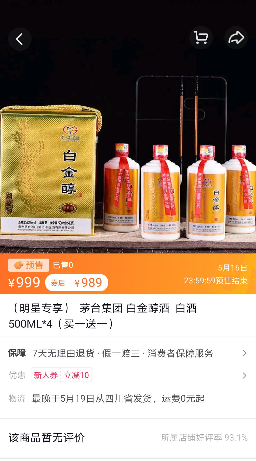 在谢孟伟抖音直播间,可以看到一款打着茅台旗号的“(明星专享)白金醇酒”,标价为4瓶999元,并且买一送一。该酒瓶身注明生产企业为贵州茅台酒厂(集团)白金酒有限责任公司。