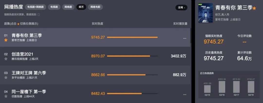 爱奇艺也收获了它想要的结果。据猫眼专业版的全网热度显示,2月17日《青春有你3》以9519.62的全网热度值居于当日所有综艺节目的首位,《创造营2021》的全网热度值则为8674.79,排在第三位。