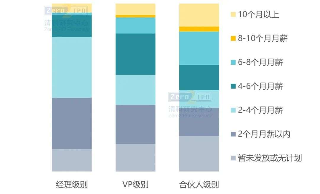 年度奖金作为中期激励方式,是员工年薪重要组成部分。随着职级的提升,发放年终奖的机构平均发放额度随之提升,而不发放年终奖的机构数量占比也随之增长。调研机构中,占比21.2%的机构2020年未对投资团队合伙人级别的员工发放年终奖。对于投资机构来说,员工职位上升至合伙人或以上级别后,对机构的投资运营将起到决定性作用,因此机构除了中短期激励外更需通过投资收益分配、股权激励机制等长期激励形式加强对高管行为的约束。
