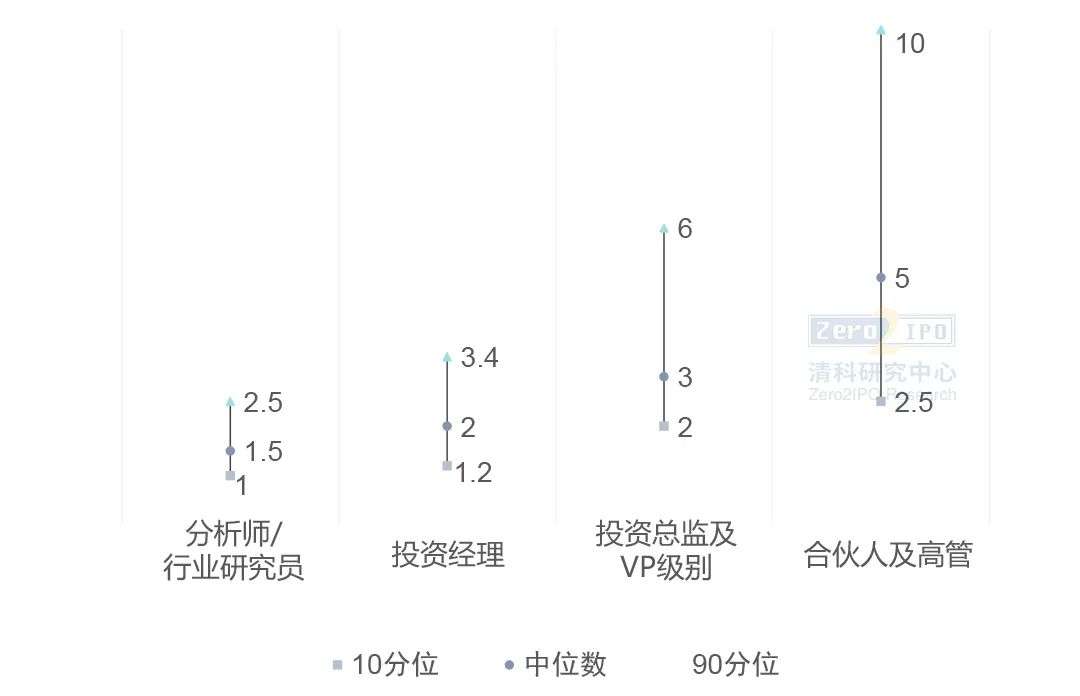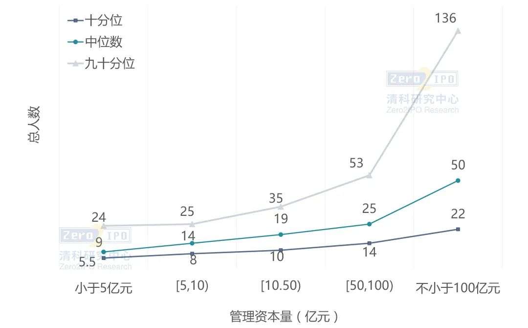 随着投资机构管理资本量的扩张,人员总规模呈现增长趋势。募集基金规模更高,按期完成投资的压力随之增长,因此需要更多的投资人员去发掘项目,也需配置更多支持性岗位人员去负责基金管理、投后管理、风险控制等事务。但总体来说,机构普遍仍以“小而精”的模式运营,管理资本量不足100亿元的机构中,超过 90%的机构人员总规模均未超过50人,少数机构人员总数甚至低于10人。而机构管理资本量超过100亿元后,人员规模增长更加显著。人员总数超过100人的数十家调研样本机构,管理资本量均达到百亿级。
