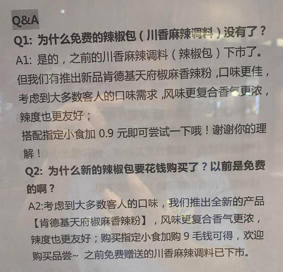 肯德基开始收调料费,0.9元一包辣椒粉,合理吗?