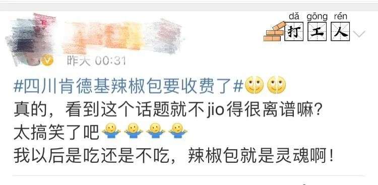 不少网友对肯德基辣椒包的收费行为表示不解,甚至觉得“很离谱”“太搞笑”。