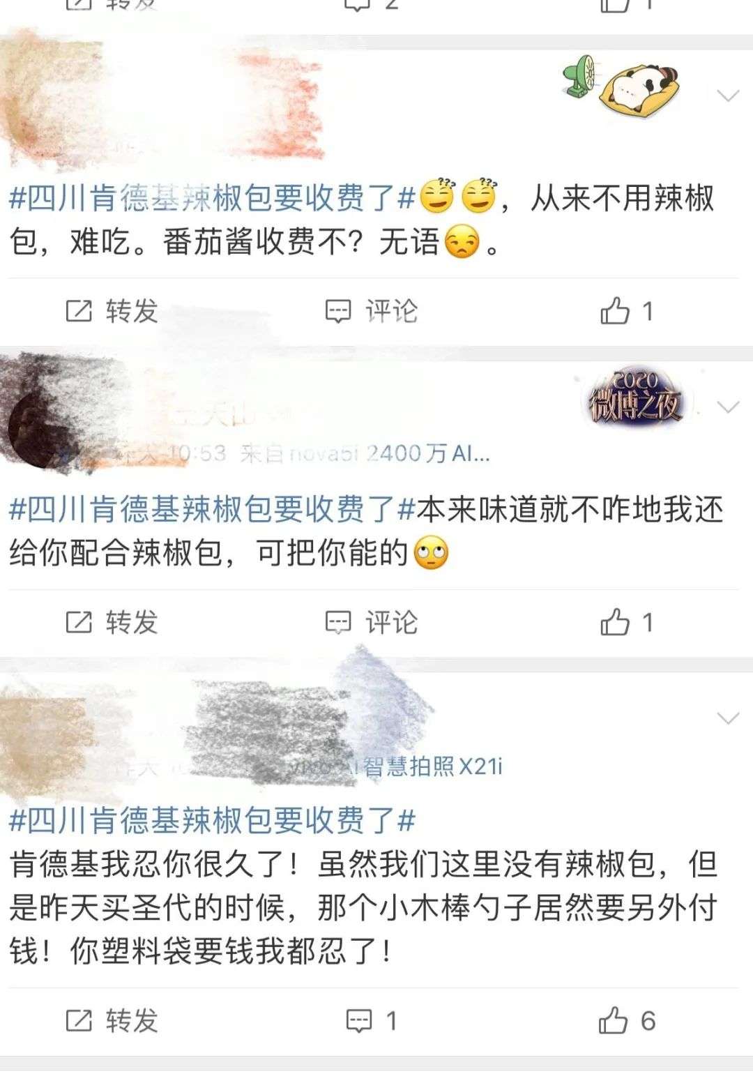 也有网友开始考虑是否还继续在肯德基消费,“毕竟现在美食店那么多,卖炸鸡的又不止他们一家。”“收费就算了,还没有以前的好吃,吃完新品辣椒包,感觉自己要与肯德分手了。”