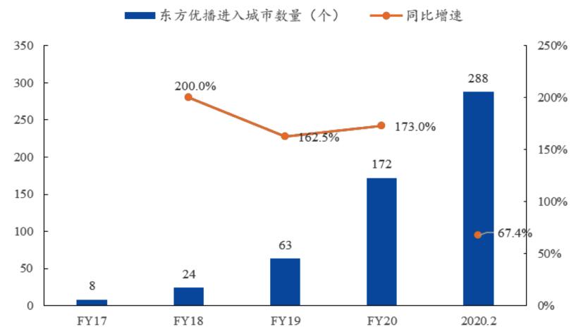 2019财年末,东方优播进入中国15个省份,63个城市。而截至2021年2月,东方优播已进驻26省,99个城市,288个地区,年增长超过160%,其中95%校区分布在三、四、五线城市。