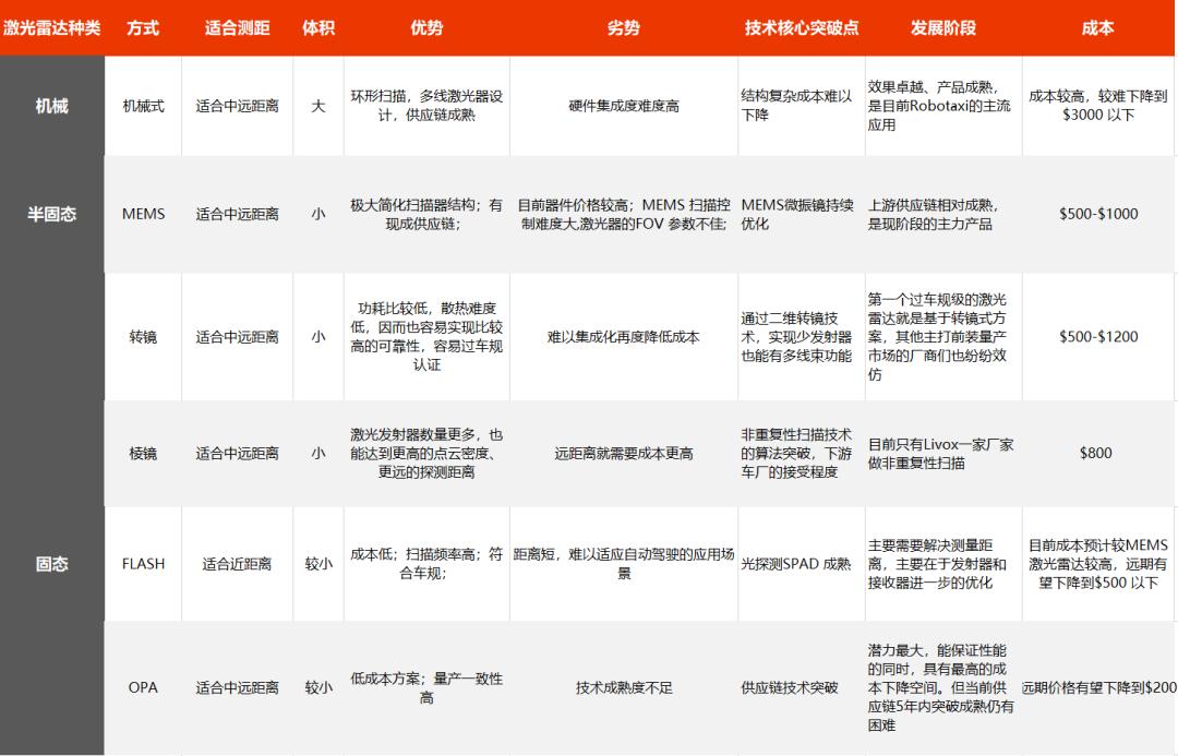 不同类型的激光雷达,优缺点也很明显。