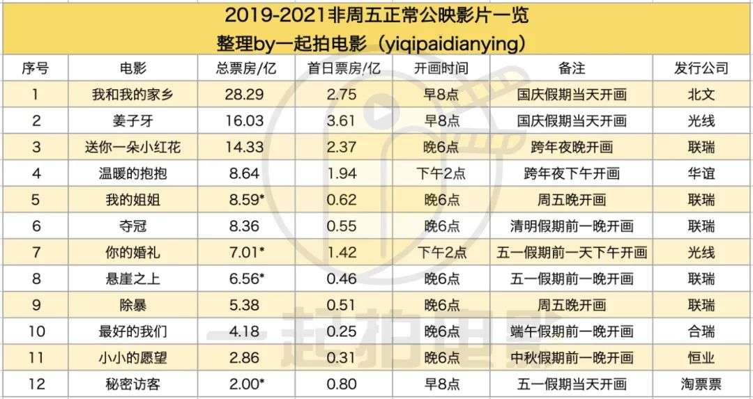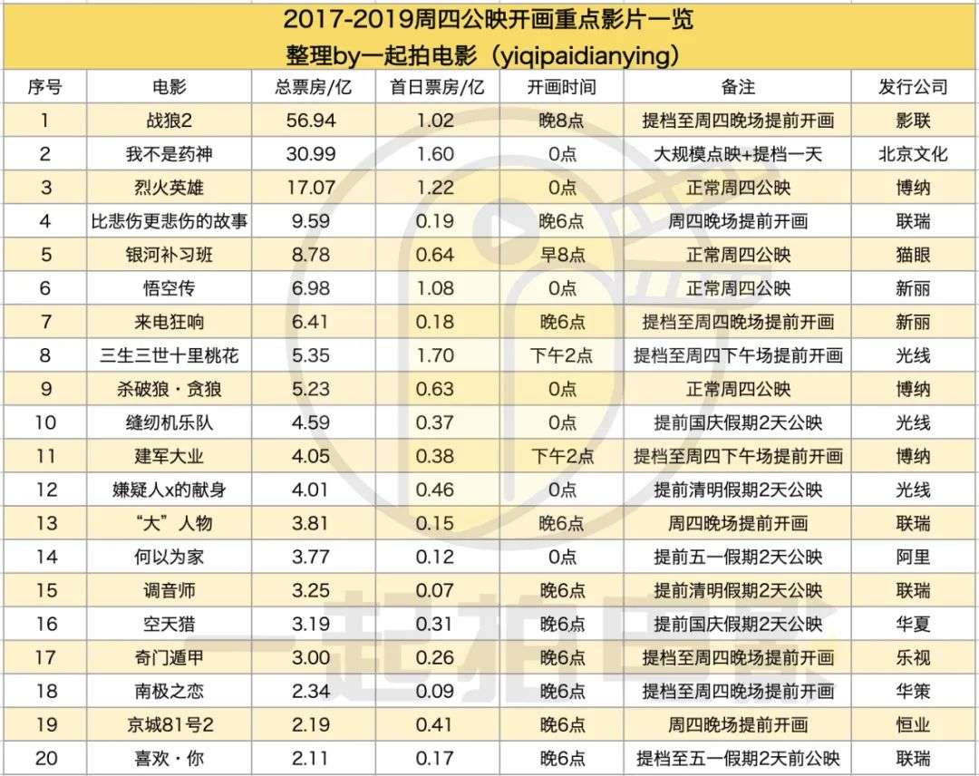 需要注意的,这里总结的“周四开画”,是广义上的周四开画,这其中包括了在法定节假日档期的前两天进行公映的影片。比如如果5月1日-3日是五一小长假,大多数影片都选择在4月30日进行公映,类似影片在周五公映。但是对于4月29日公映的影片,虽然当天并不是周四,但是也相当于“周四”开画。