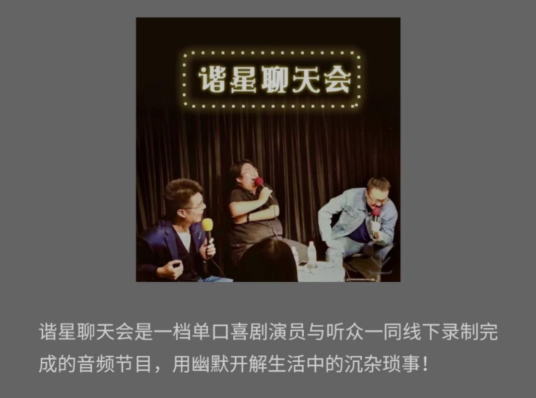 例如,单立人线下举办喜剧节目《谐星聊天会》,通过在线音频的形式将一档小范围的脱口秀扩散至更多的兴趣人群。