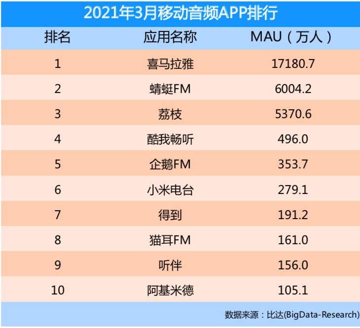 去年,喜马拉雅移动端用户累计使用时长达15643亿分钟,约占国内所有在线音频平台移动收听总时长的3/4。比达咨询数据显示,截止今年3月,喜马拉雅移动端月活跃用户达1.7亿,相当于第2-10名移动音频APP月活数据的总和。