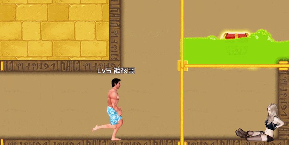 例如笔者在一次将海水与岩浆混合后,判定“可以通过”的裤衩哥却被地形所挡住,不断奔跑但又无法到达女角色身边。然而在经历近两分钟持续不断的努力后,他终于连人带石一块推走,最终独自站在终点振臂庆祝,这份精神让人不禁为其动容(笑出了声)。