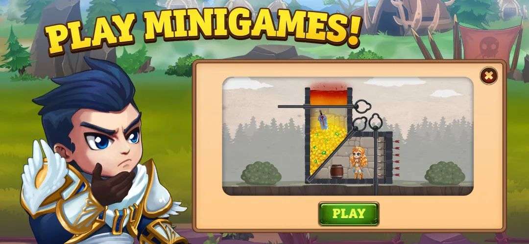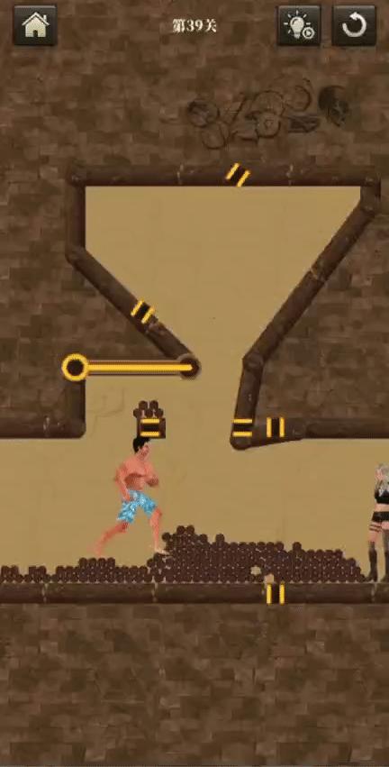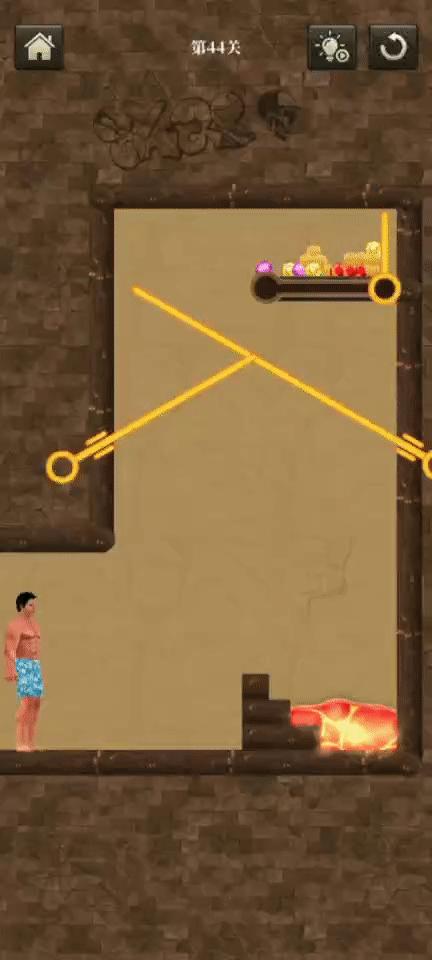 游戏采用了与广告中一致的“拉针”式闯关玩法。玩家需要观察地形,再通过按正确顺序拉走关卡中设置的障碍针,来去除诸如岩浆、恶犬等威胁,帮助这位“裤衩哥”拿到金币与宝箱,达到通关要求。