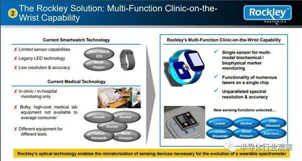 从技术上来说,红外频谱仪需要扫描的频点会多于PPG,此外其读出的信号是频域信号,而非PPG的时域回波信号,因此技术上要比PPG挑战度更大。尤其是需要把红外频谱仪做到可穿戴设备中时,需要实现小型化的光源和能在频段上都有较好灵敏度的PD,这一点对于光模组的设计具有相当的挑战,因此相对于PPG来说进入门槛更高,能做好的公司也较少。这也是Rockley在投资信息披露中,把其频谱仪作为拳头产品的重要原因。