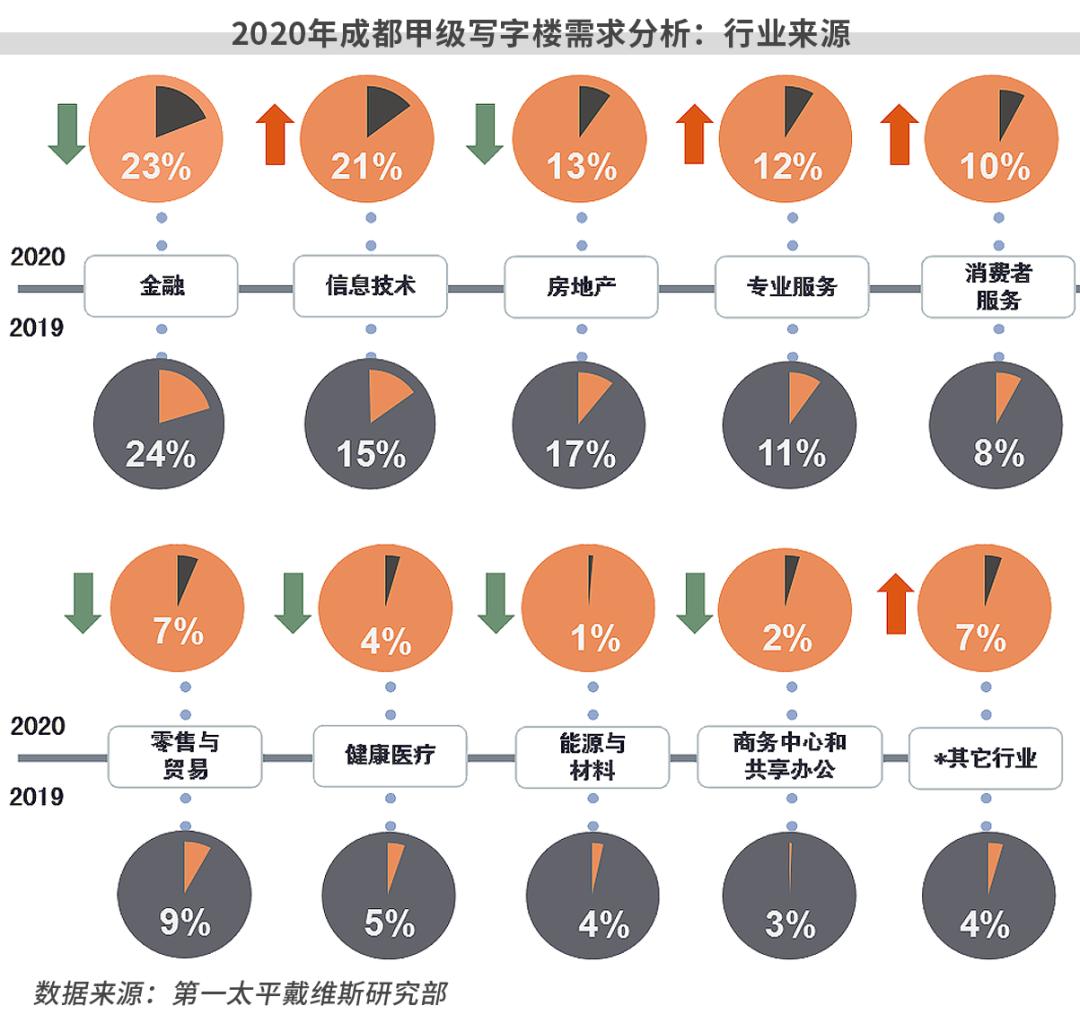 从需求端来看,消费者服务和金融 “两驾马车”并驾齐驱,为写字楼租赁需求端加足马力。