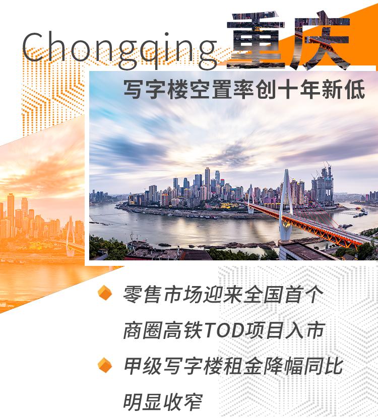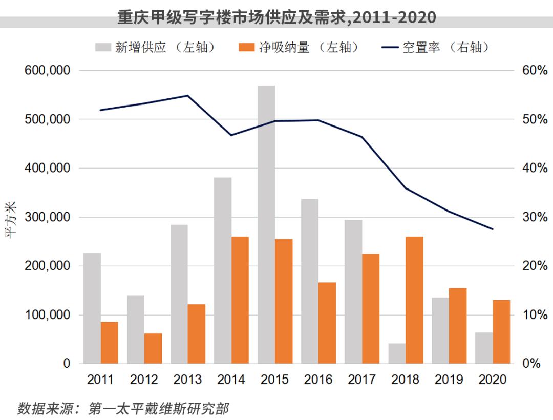 - 2020年的重庆甲级写字楼市场处于一个供应小年,重庆来福士A座成为全年全市唯一的新增供应项目,为市场带来了6.4万平方米的新增供应,推高甲级写字楼总存量至240万平方米。较少的供应以及多宗大面积交易扭转了重庆上半年甲级写字楼市场受疫情影响的下行局面,市场空置率同比下降3.6个百分点至27.5%,市场空置率创十年新低。