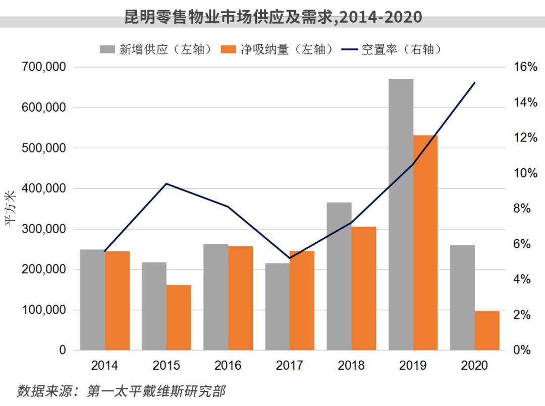 受疫情影响,2020年昆明零售市场需求减弱,全市购物中心平均空置率同比明显上涨约4.6个百分点,达约15.1%。