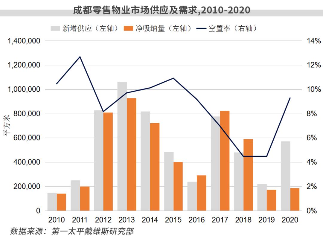 - 2020年成都零售市场迎来57万平方米的新增供应,是2019年全年供应量的2倍有余,将全市零售物业总存量推升至707万平方米。受疫情影响,成都市场购物中心平均空置率上半年大幅上涨,而自下半年起开始缓慢回落,整体市场呈现复苏态势;全年市场平均空置率同比上升4.8个百分点,达到9.3%。