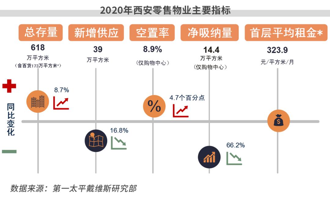 - 2020年西安零售物业市场共迎来三个优质项目开业,合计新增供应约39万平方米,相比去年有所减少,全市零售物业总存量达到618万平方米。购物中心平均空置率年内呈持续上升态势;全年同比上涨4.7个百分点至8.9%。钟楼-解放路商圈需求显露疲态,空置率上涨最为明显,拉动全市购物中心空置率持续攀升。