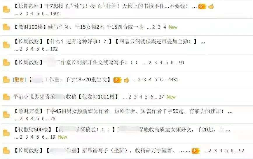 在国内最大的网络文学相关话题的论坛—龙的天空(简称龙空)中,其中一个名为“黑市”的板块,有大量的网文工作室长期招纳专门的网文写手,源源不断地生产包括霸总、赘婿、穿越、重生等各类型市面上大热大火的爽文。