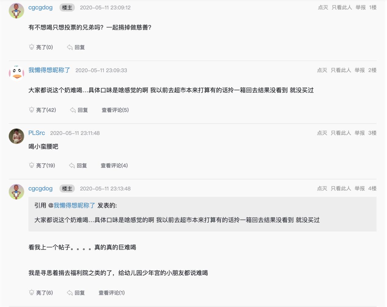 去年5月,两大选秀节目热播时,一条“蒙牛 难喝”的微博一度登上了微博热搜。一位给《青春有你》打投的粉丝称,自己搬了30箱花果轻乳到办公室,免费赠送给公司员工,后来他们都表示“不想再喝了”。不少粉丝群或社交平台上,很多粉丝也吐槽“这是把奶兑稀了所以叫轻乳”,并号召不想喝只想投票的粉丝一起捐掉做慈善。