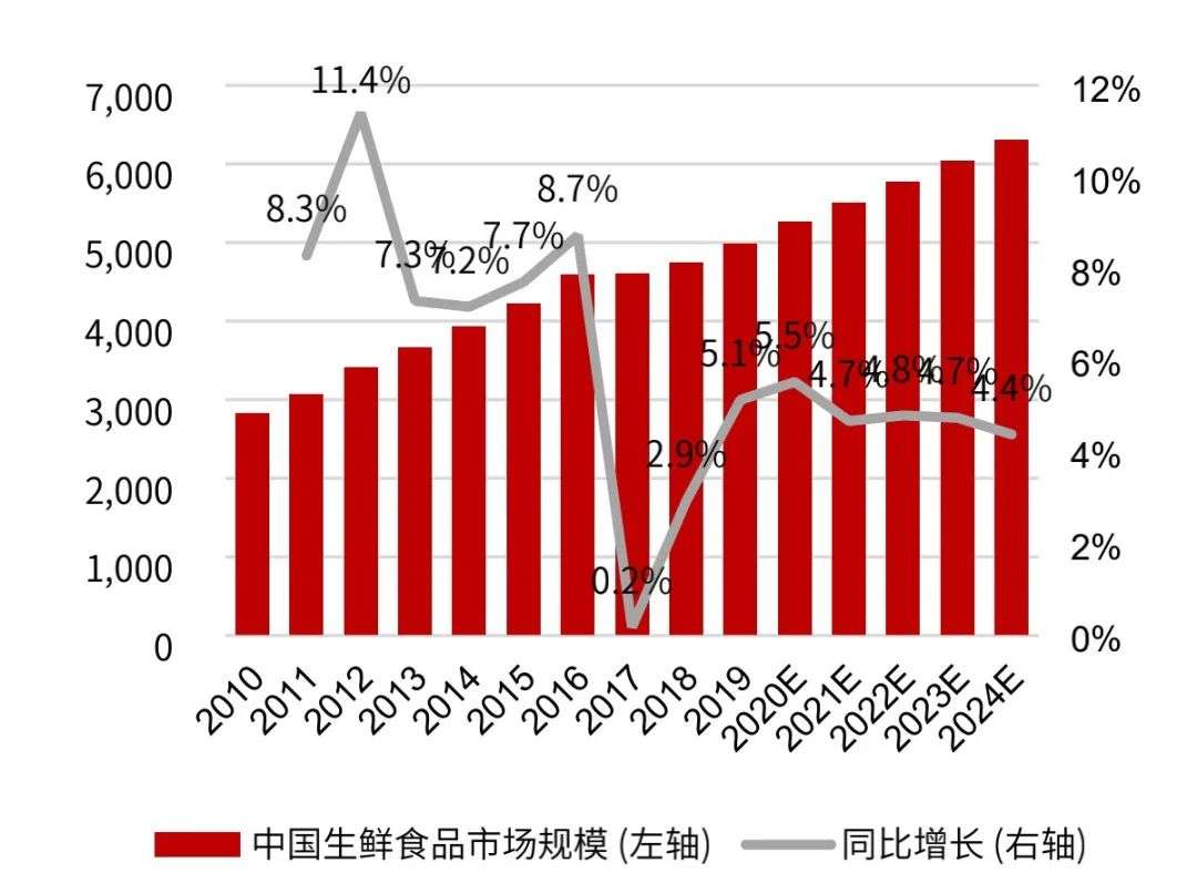 欧睿国际预测,2024 年中国的生鲜食品零售市场规模将达到6.3万亿元,从2019年到2024 年将以 4.8%的复合增长率稳定增长。
