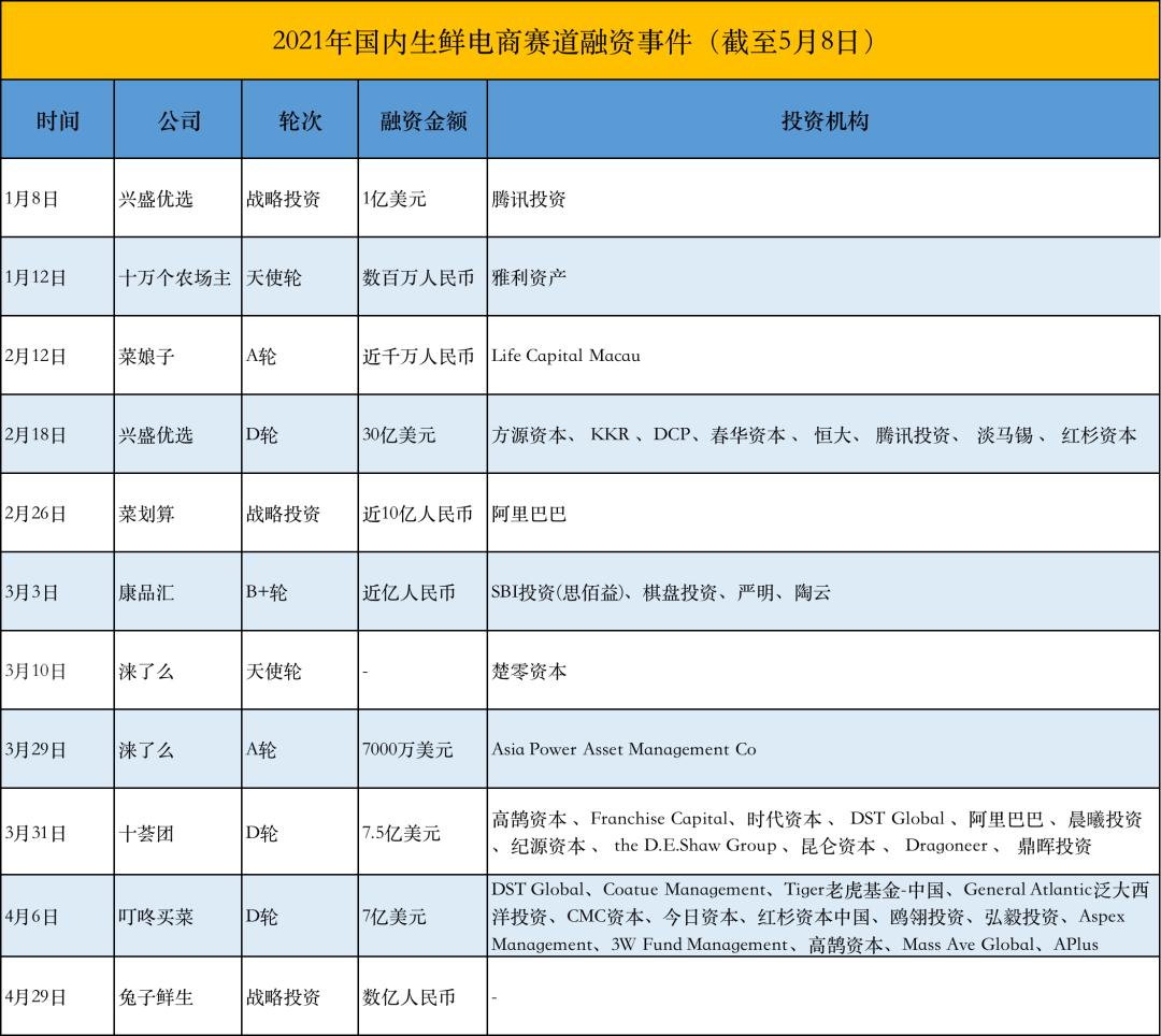 2月19日,兴盛优选获得D轮30亿美元融资;4月十荟团完成了新一轮高达7.5亿美元融资;4月叮咚买菜宣布完成7亿美元D轮融资......