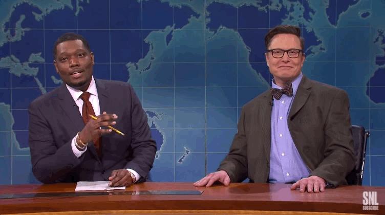 节目开始一小时后的新闻吐槽单元「Weekend Update」中,马斯克扮演了一个带着领结的加密货币专家。